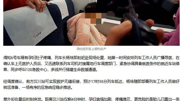 12月15日,成都开往张家港的D3078次列车上一名怀孕32周的孕妇突发腹痛并出现“足先露”险情,列车长指挥搭建临时产房,紧急停车汉川站,医护人员迅速登车接生。18时02分母子平安出生后被转送医院救治。