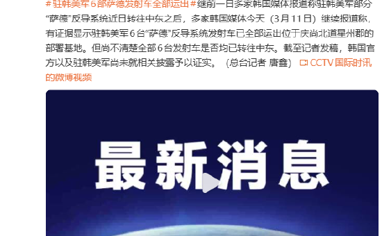 驻韩美军部署于庆尚北道星州郡的6台“萨德”反导系统发射车已全部运出,具体去向尚不明确,韩国官方和驻韩美军尚未确认相关信息。